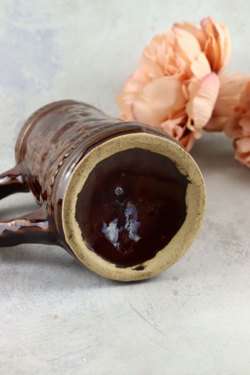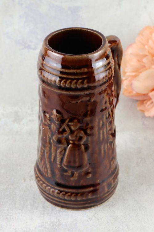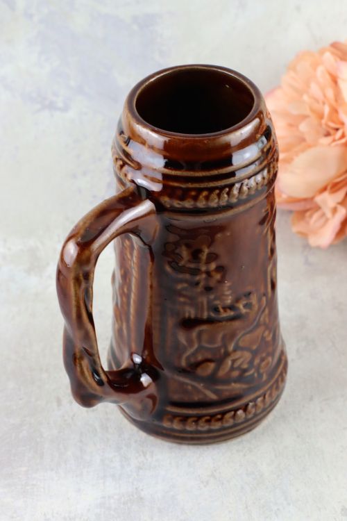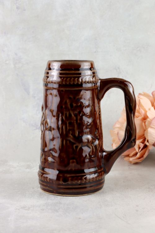 Brązowy ceramiczny kufel z motywami myśliwskimi.