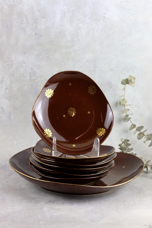 Brązowy zestaw talerzy Ryszard wykonany w Zakładach Porcelitu Stołowego w Pruszkowie. Szkliwo w kolorze ciepłego brązu, z delikatnym złotym zdobieniem.