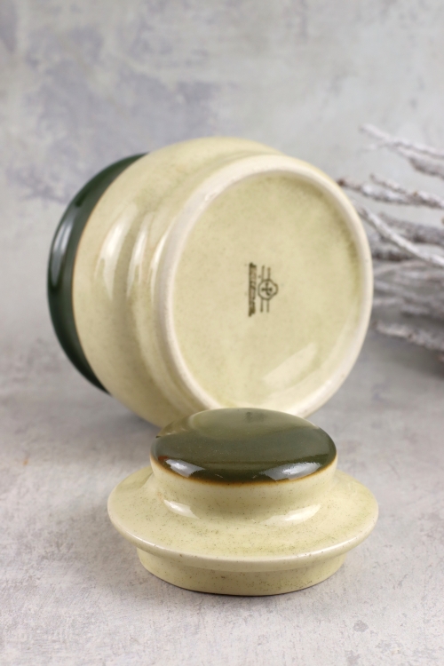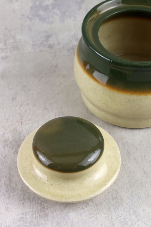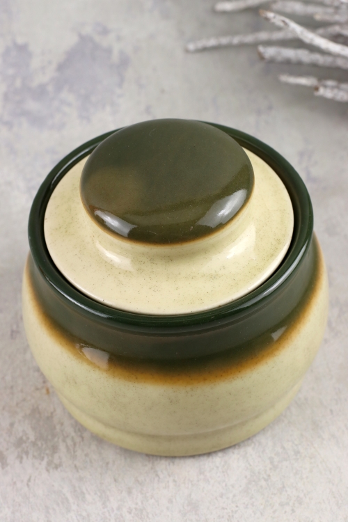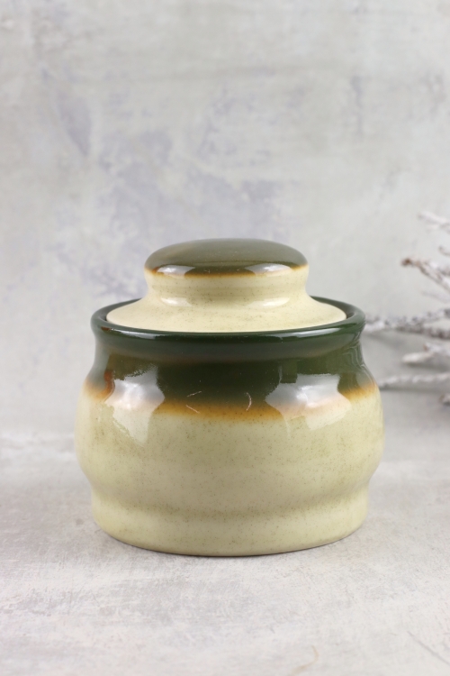 Ceramiczna cukiernica wykonana w Zakładach Porcelitu Stołowego “Pruszków”. Szkliwo w kolorze beżowym, przechodzące w grafitowy.