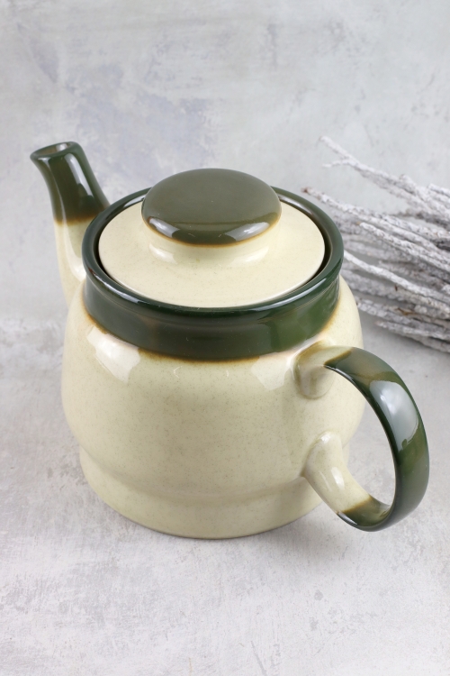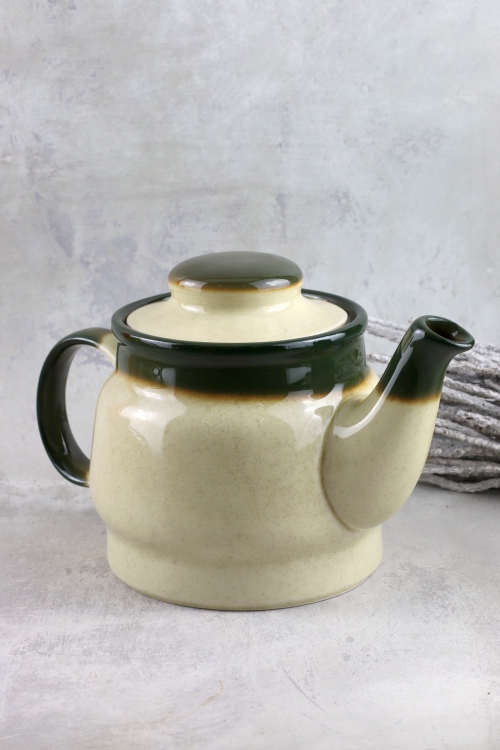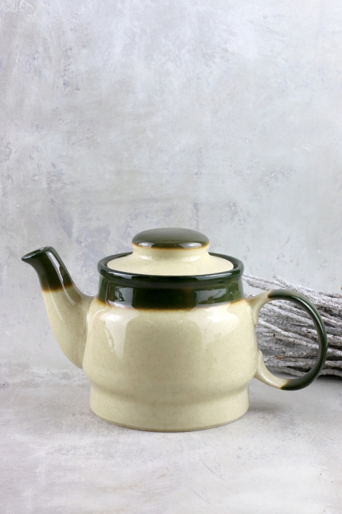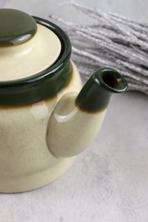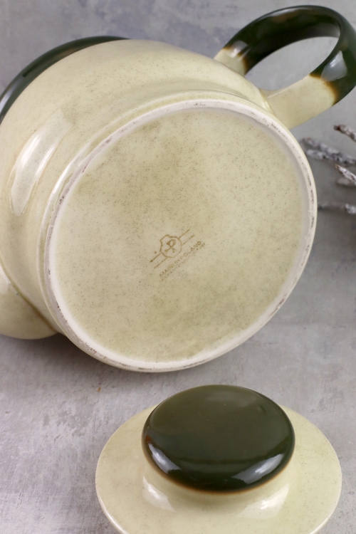 Ceramiczny dzbanek wykonany w Zakładach Porcelitu Stołowego “Pruszków”. Szkliwo w kolorze beżowym, przechodzące w grafitowy.