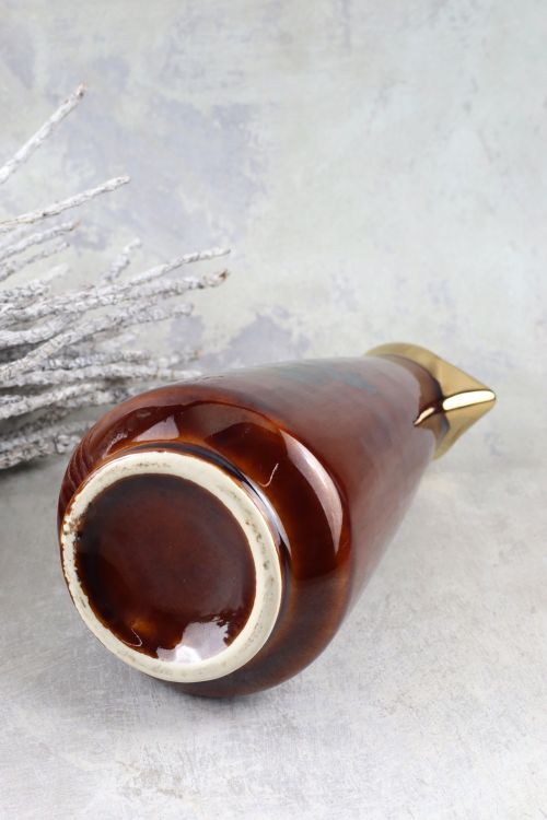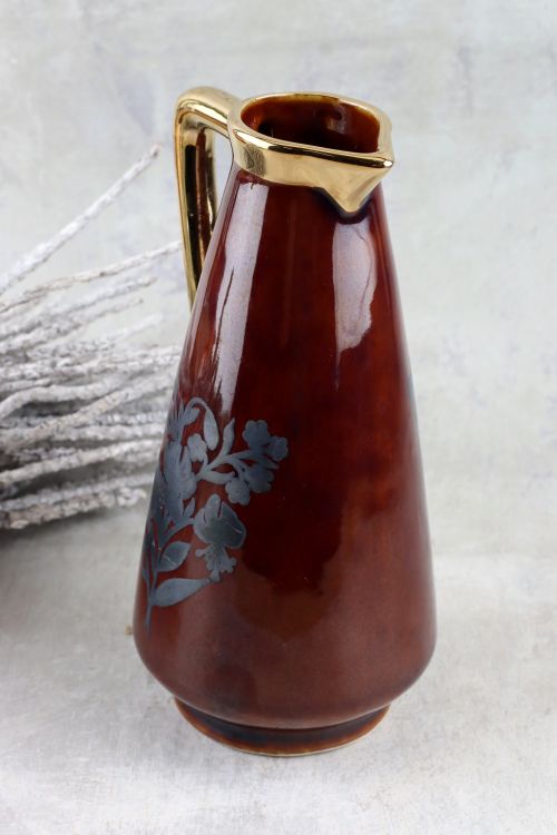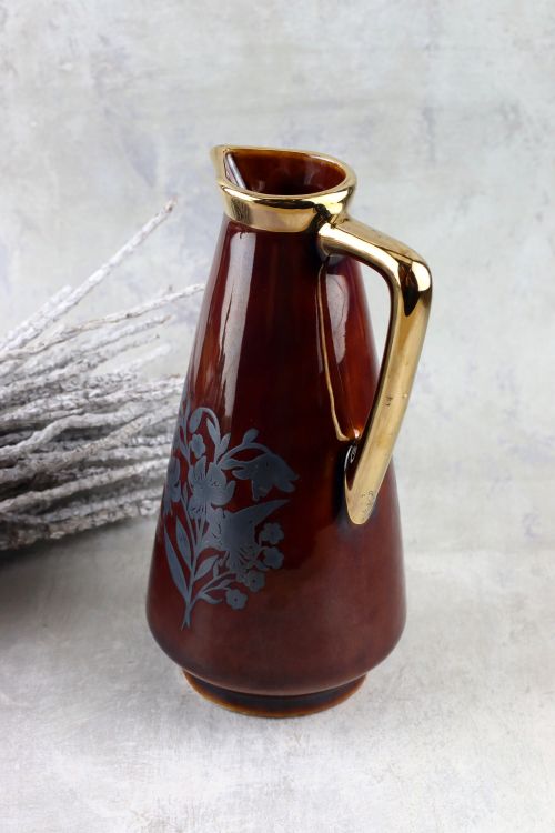 Ceramiczny dzbanuszek z kwiatowym motywem i złotymi detalami.