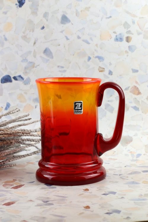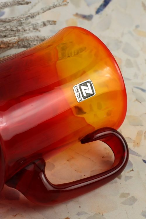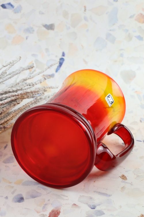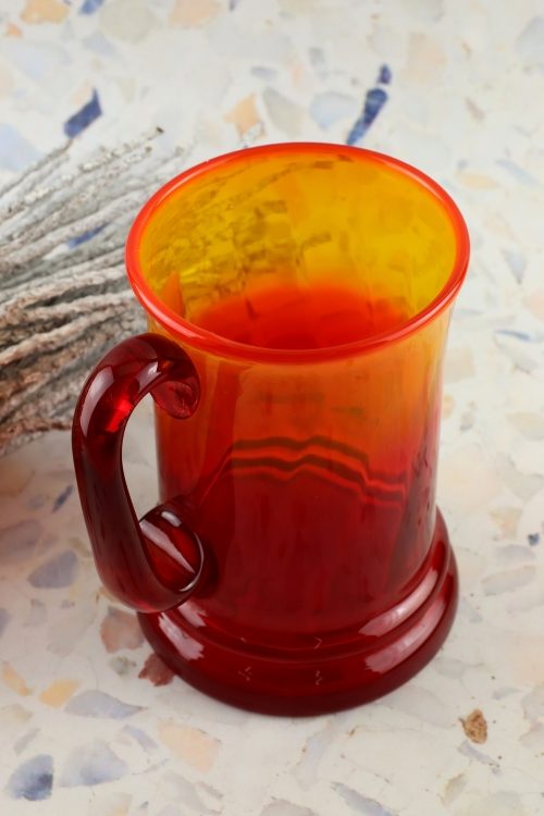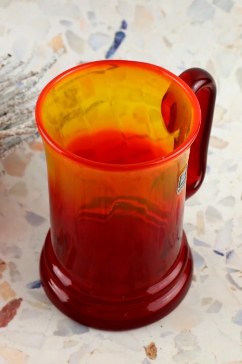 Czerwono-żółty kufel wykonany w Hucie Staszic, filii Huty Szkła Gospodarczego “Ząbkowice”.