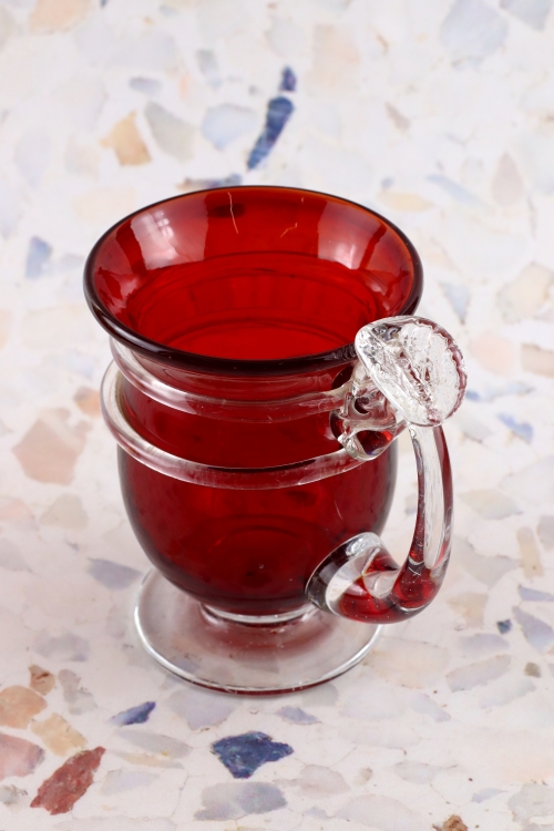 Czerwony szklany kufelek z bezbarwną rączką, podstawą i oplotem.
