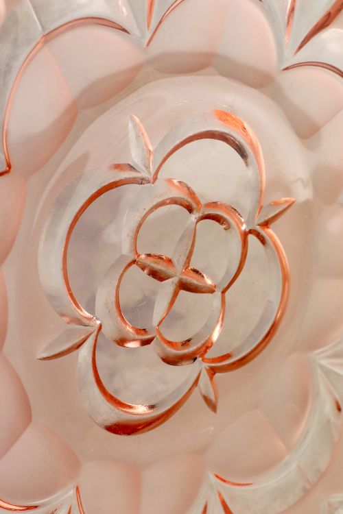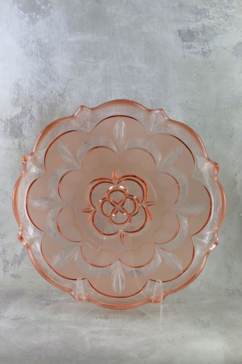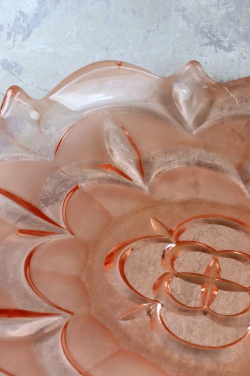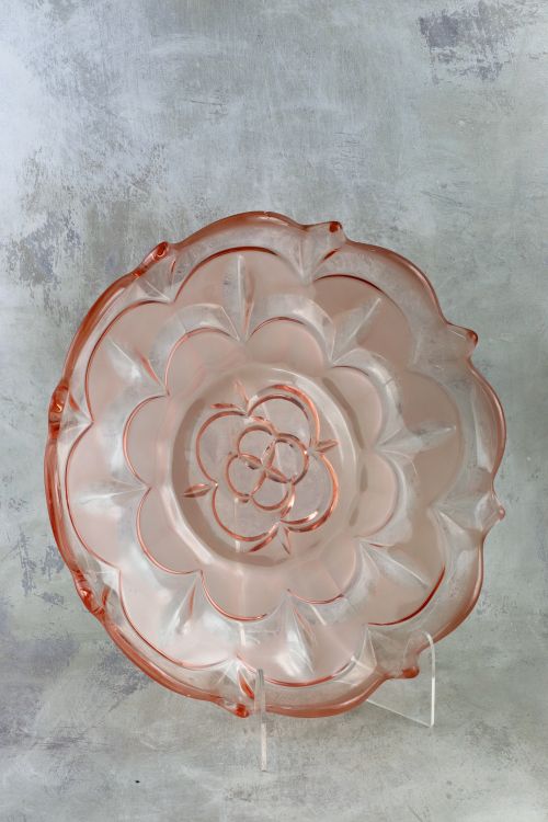Duża rozalinowa patera kwiat, wykonana ze szkła prasowanego, barwionego w masie, częściowo matowionego.