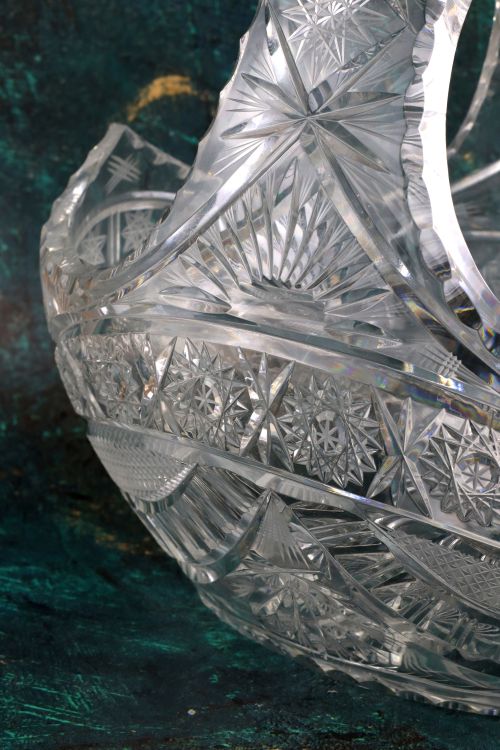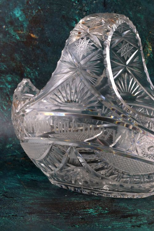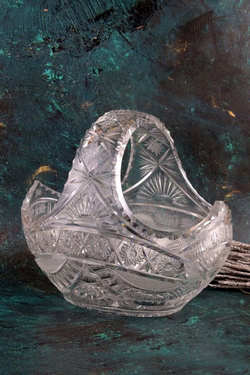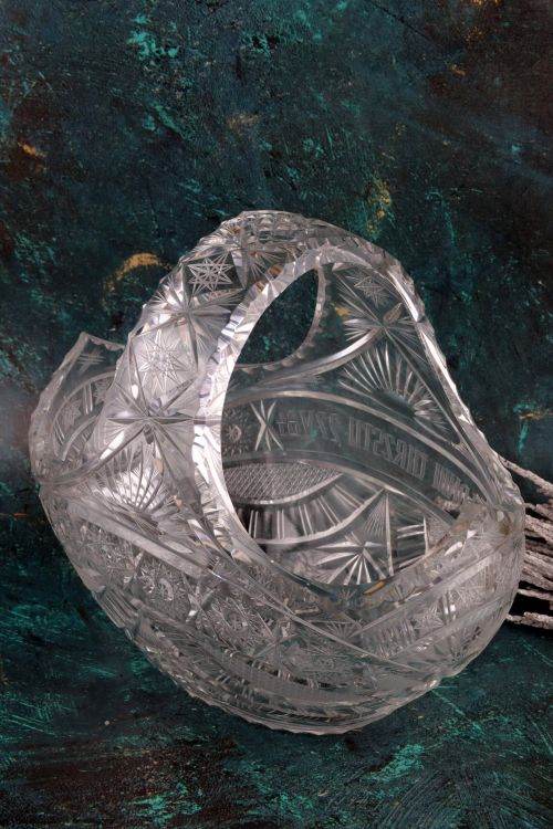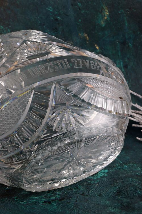 Duży kryształowy kosz z pamiątkowym napisem na boku.