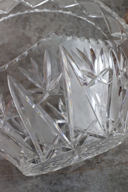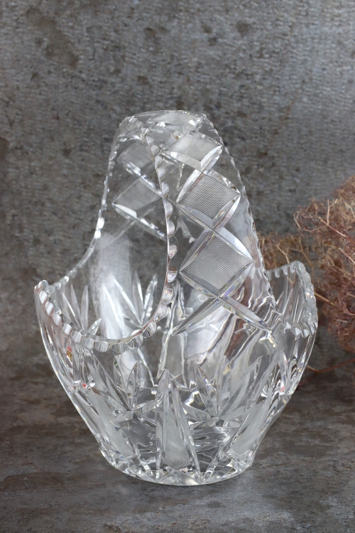 Duży kryształowy koszyk wykonany ze szkła bezbarwnego.