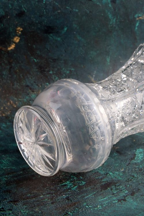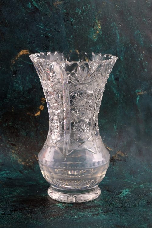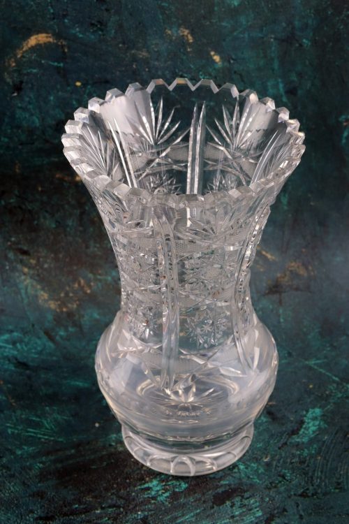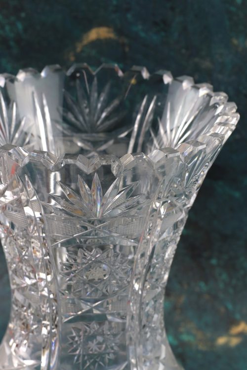 Duży kryształowy wazon na stopie.
