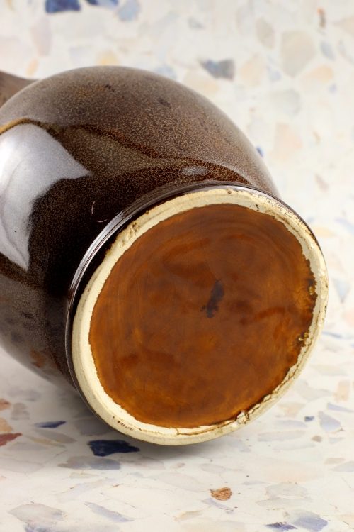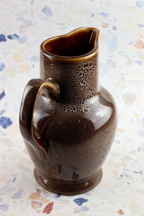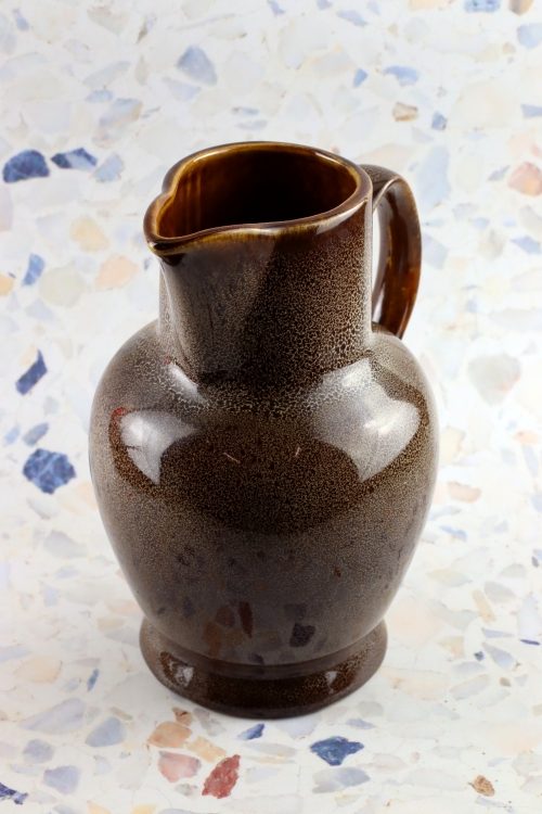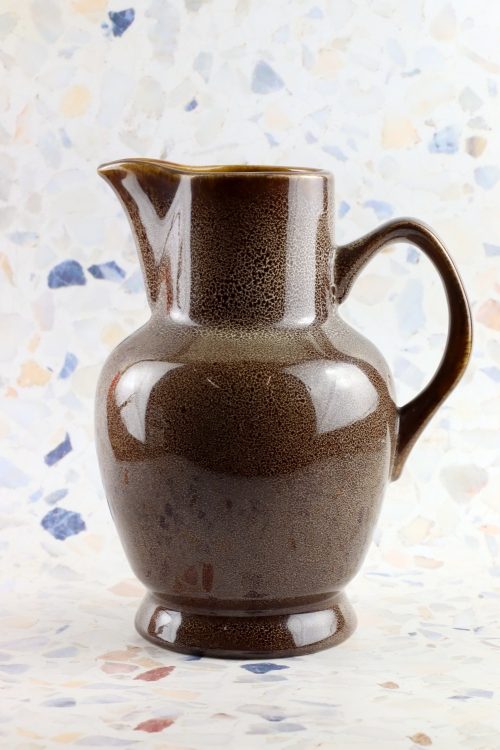 Dzbanek z zestawu Jaś wykonany w Mirostowickich Zakładach Ceramicznych. Porcelit w kolorze brązowym, delikatnie nakrapiany.