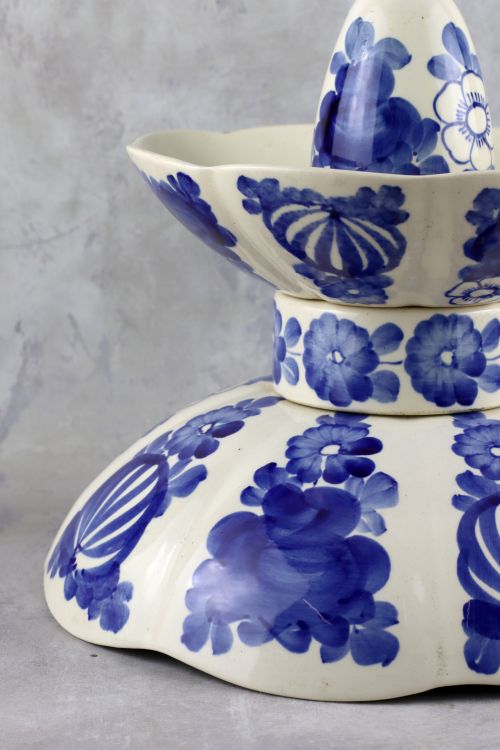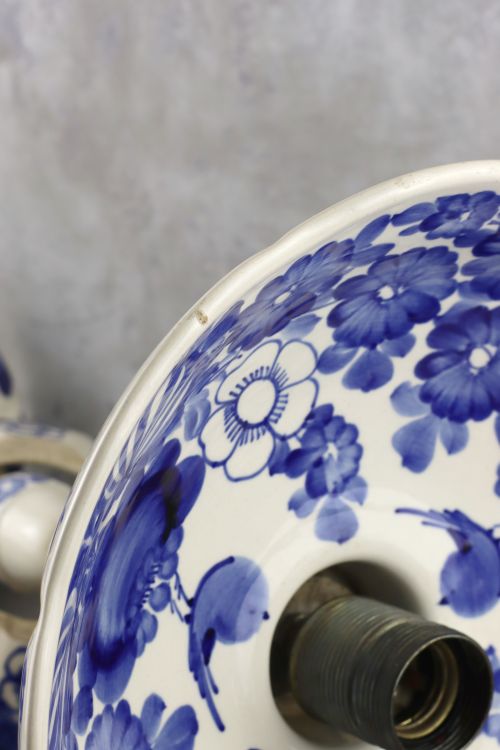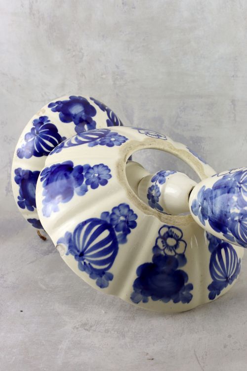Fajansowa lampa z trzema ptaszkami wykonana w zakładach Włocławek. Ceramika w kolorze złamanej bieli z kobaltową dekoracją.
