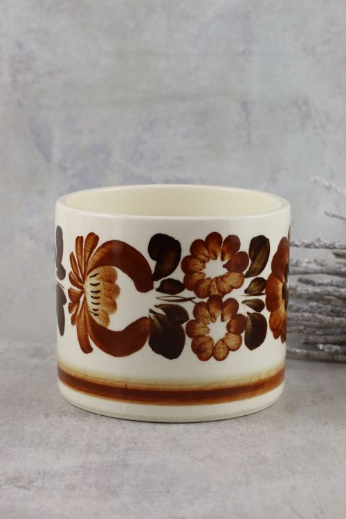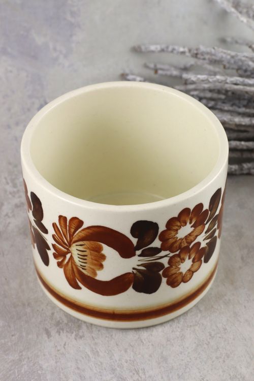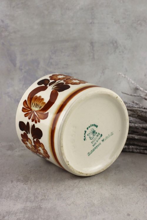 Fajansowa osłonka z brązową kwiatową dekoracją wykonana w zakładach Włocławek.