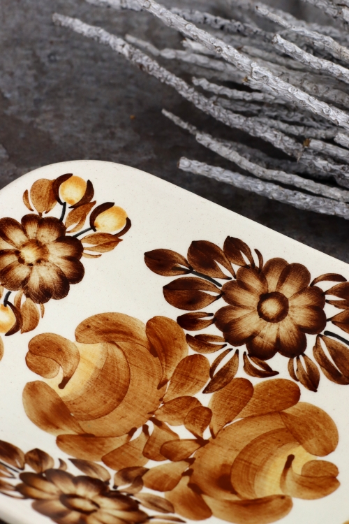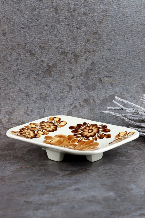 Fajansowa patera na nóżkach z brązową dekoracją, wykonana w zakładach Koło.
