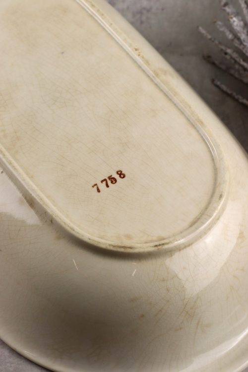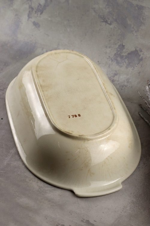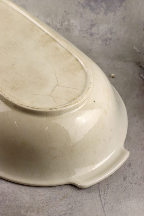 Stan dobry-, krakelura i zabrudzenia szkliwa, nierówności na spodzie, zatopione brudki, na spodzie rysy.