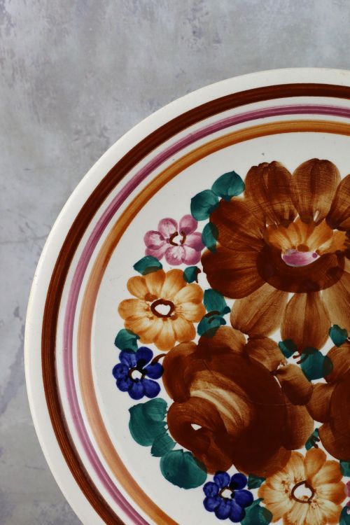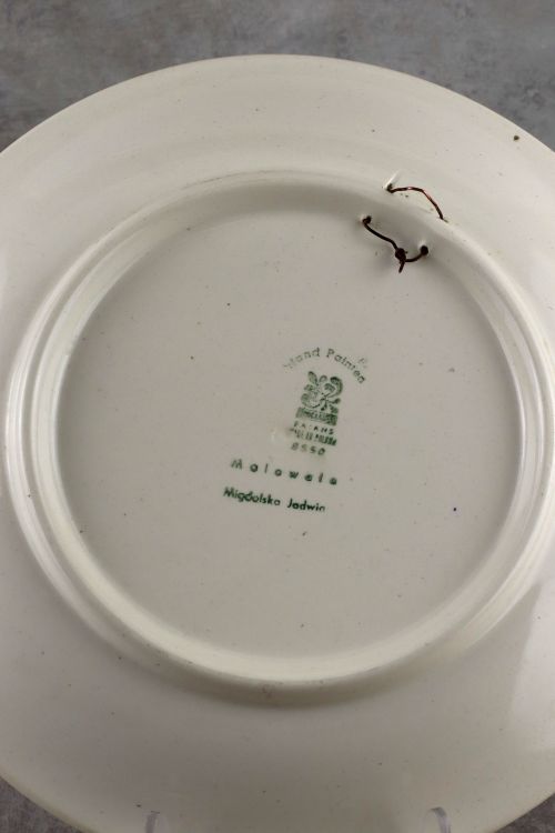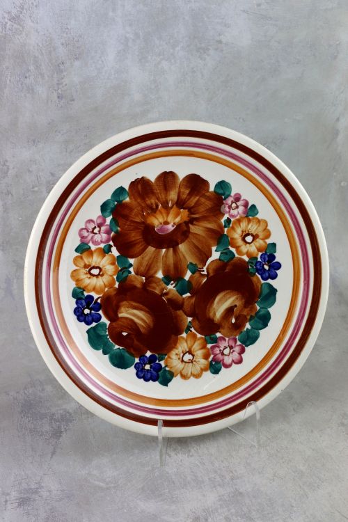 Fajansowy talerz z kolorową dekoracją wykonany w zakładach Włocławek.