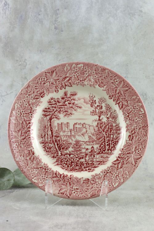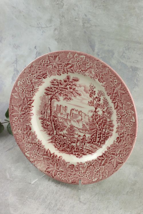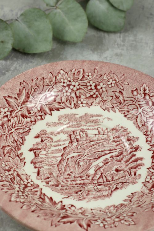 Fajansowy talerz z różową dekoracją wykonane przez firmę English Ironstone Tableware.
