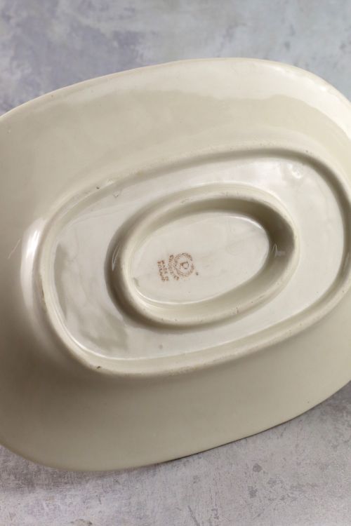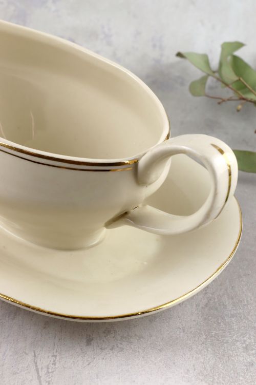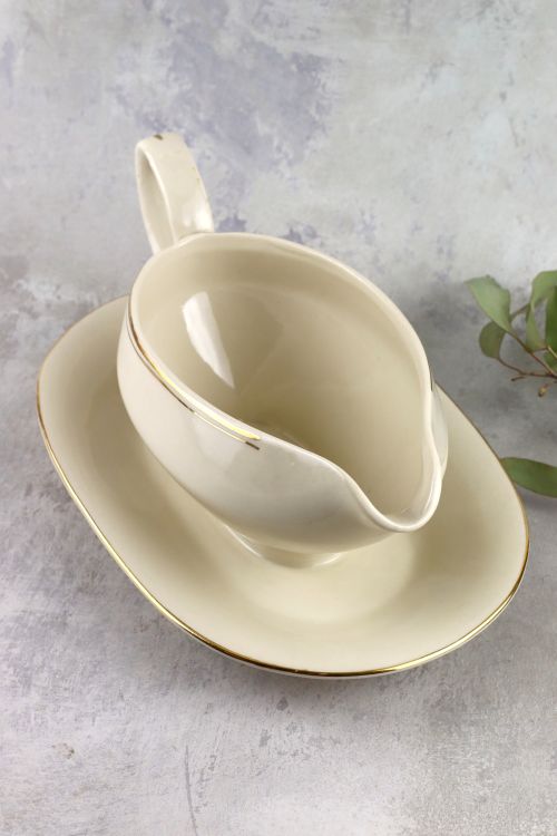 Kremowa sosjerka ze złotym dekorem wykonana w zakładach Chodzież.