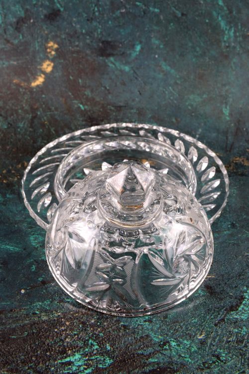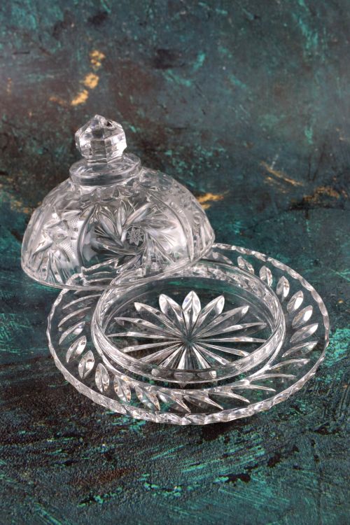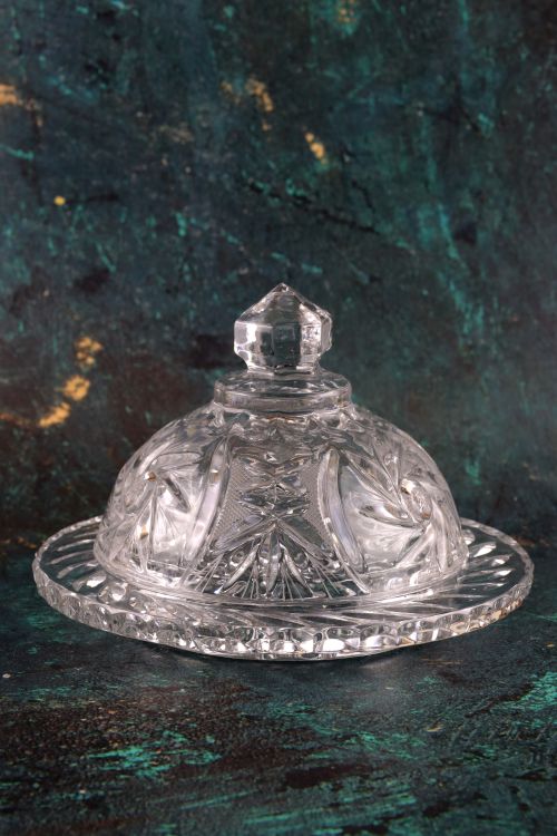 Kryształowa maselniczka wykonana ze szkła bezbarwnego.
