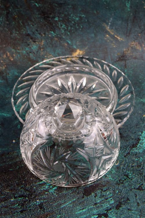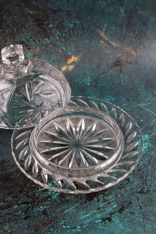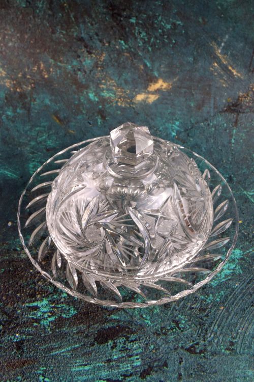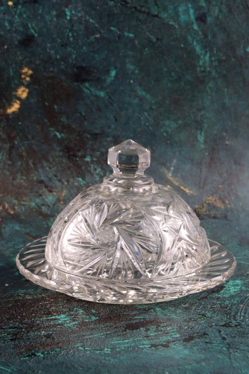 Kryształowa okrągła maselniczka wykonana ze szkła bezbarwnego.