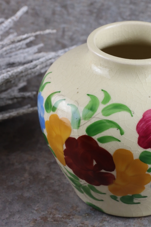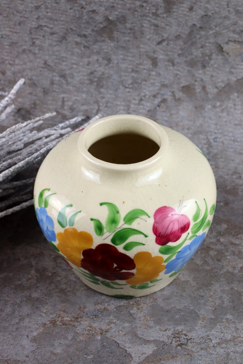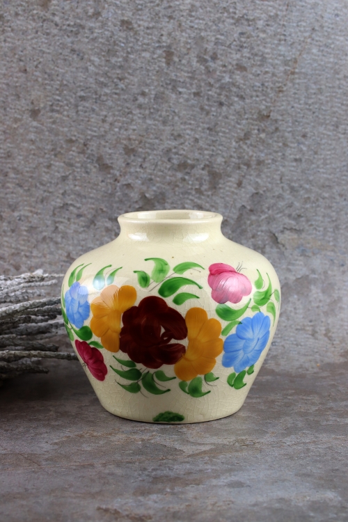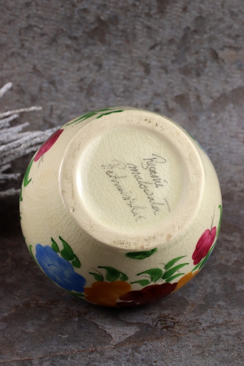 Ręcznie malowany fajansowy wazon, dekorowany kwiatowym motywem. Na spodzie sygnowany “ręcznie malowała Pietrusińska”.