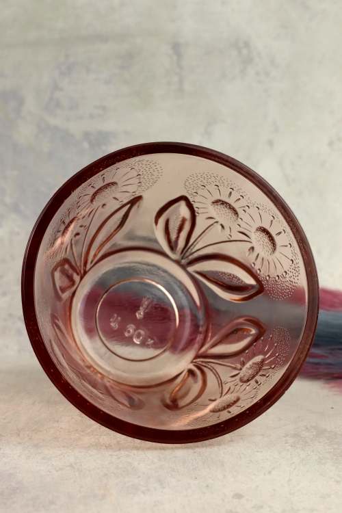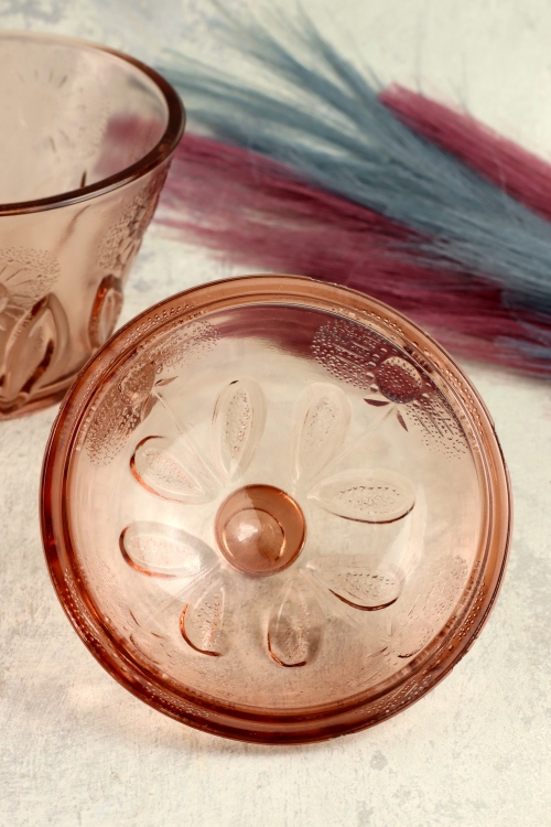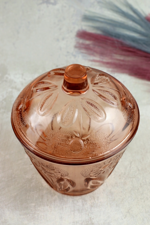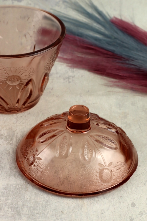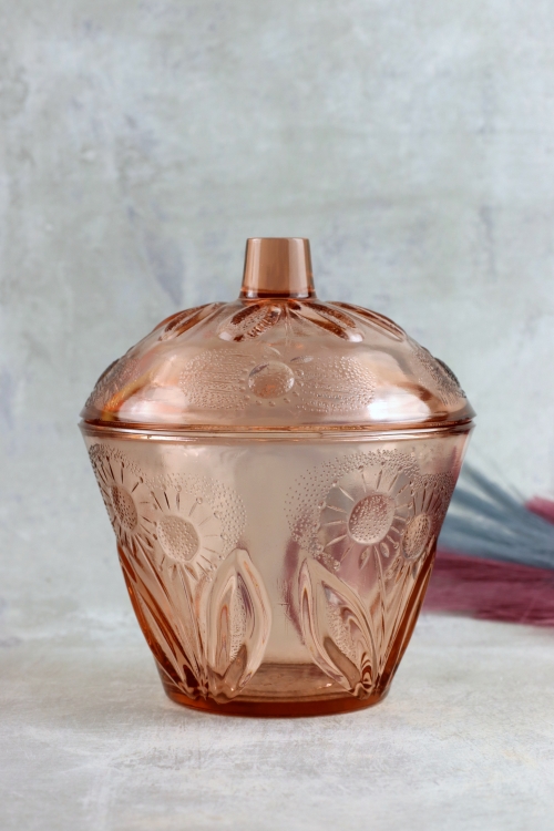 Rozalinowa cukiernica z kwiatowym motywem wykonana ze szkła prasowanego, wyprodukowana na terenie ZSRR.