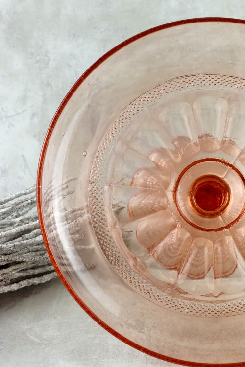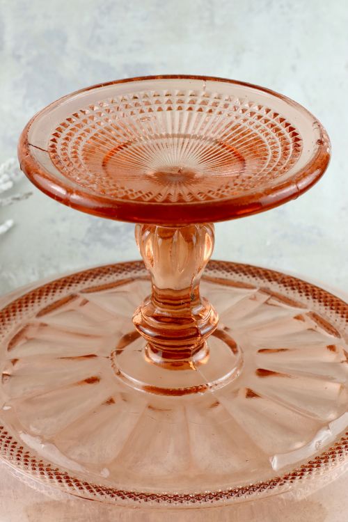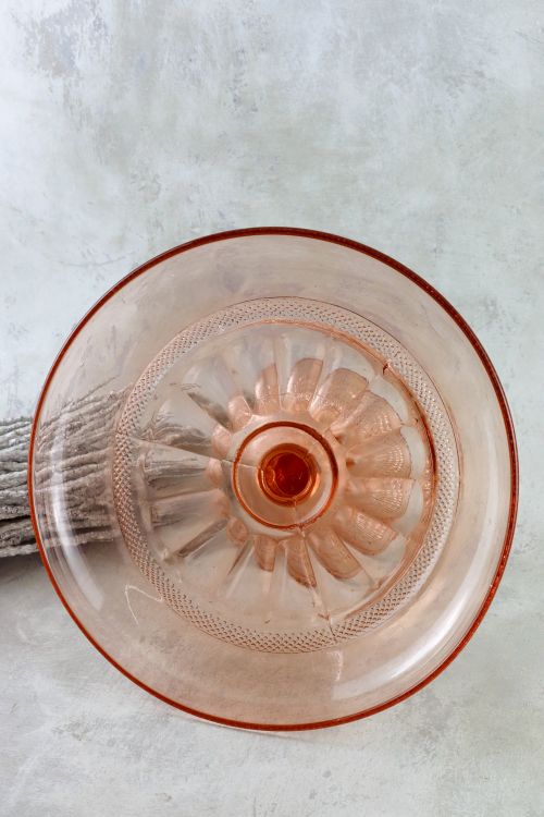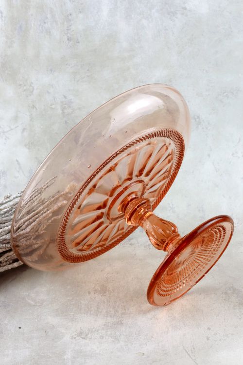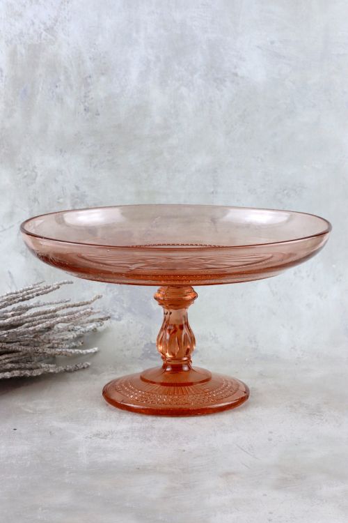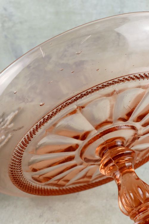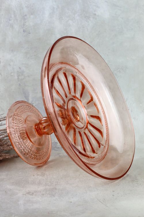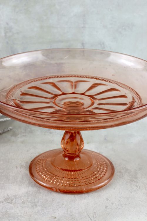 Rozalinowa szklana patera na nodze. Szkło prasowane, barwione w masie.