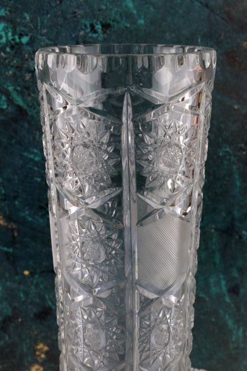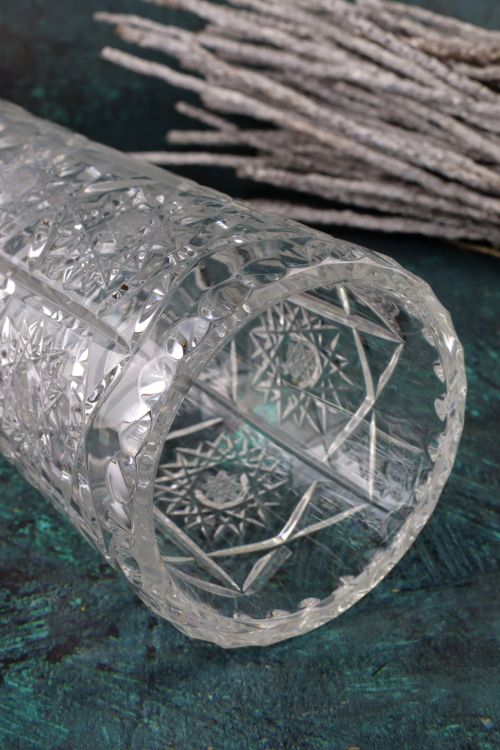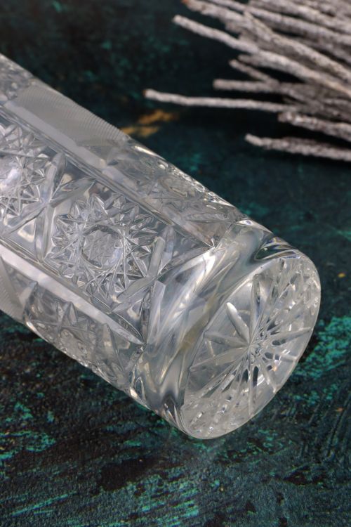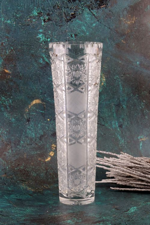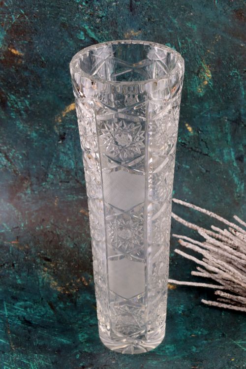 Smukły kryształowy wazon z bogatym zdobieniem.