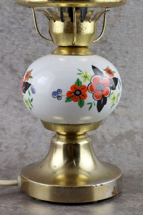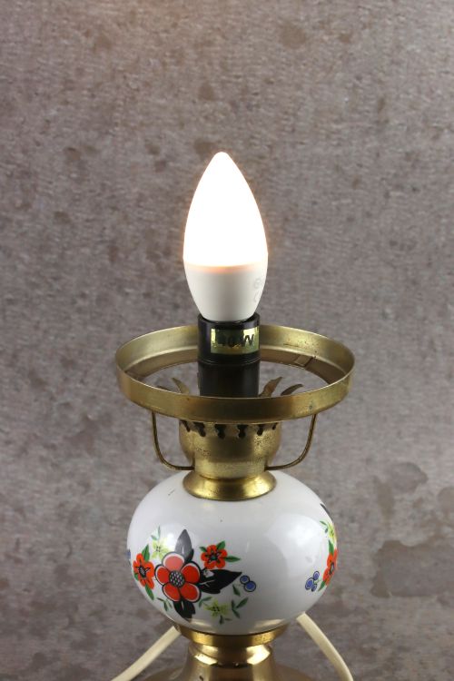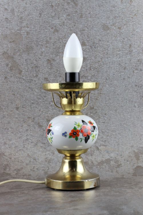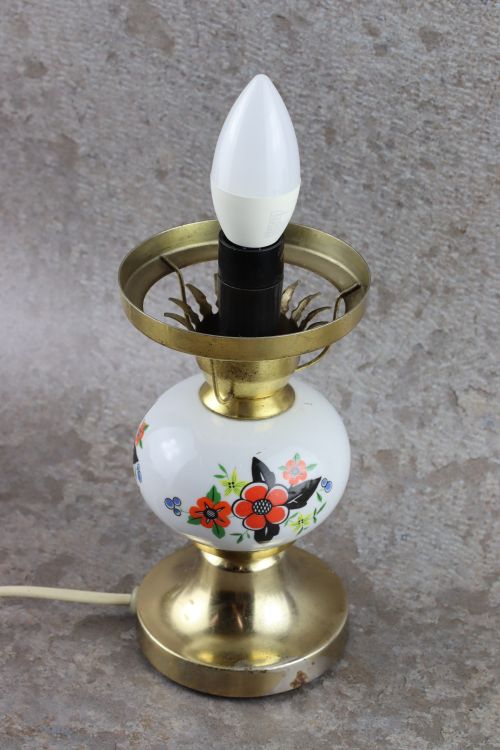 Stara lampka z metalu i porcelany, dekorowana kwiatowym motywem.