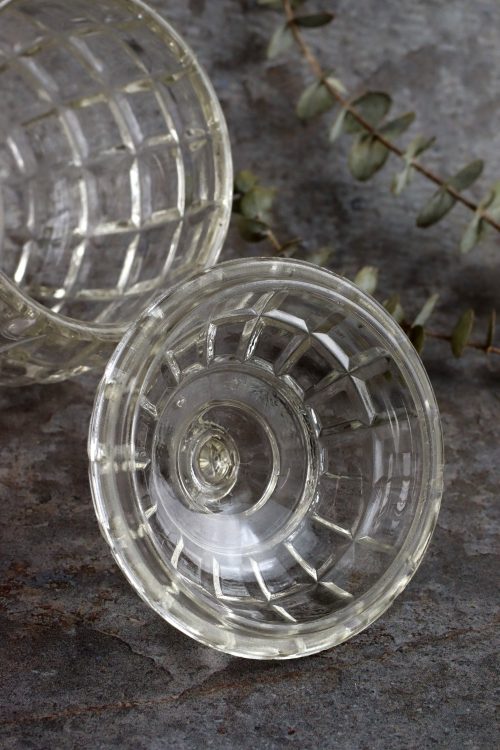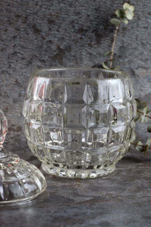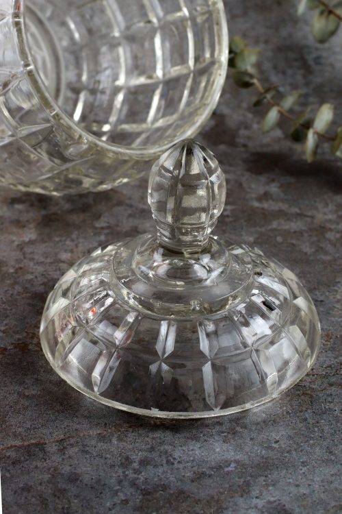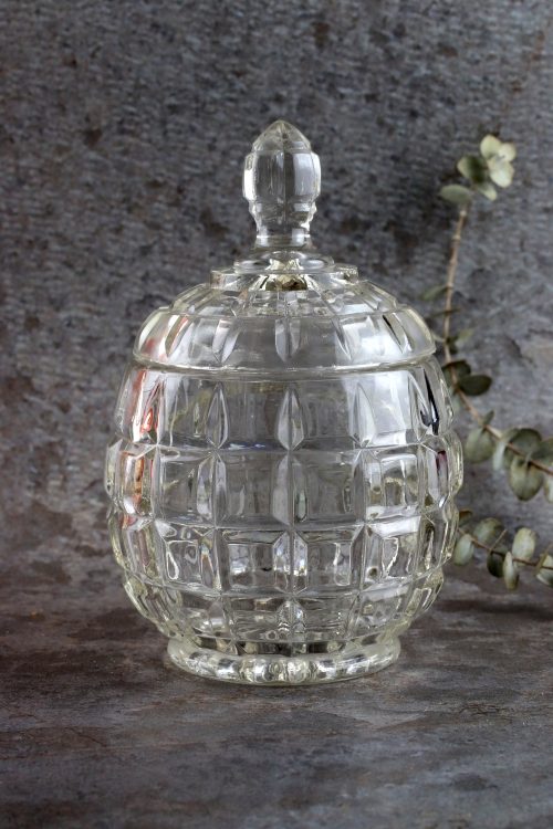 Szklana bezbarwna bomboniera Granat wykonana w Hucie Szkła Gospodarczego “Ząbkowice”.