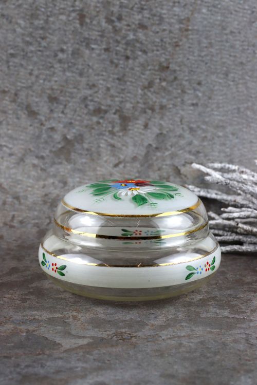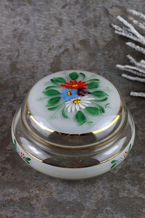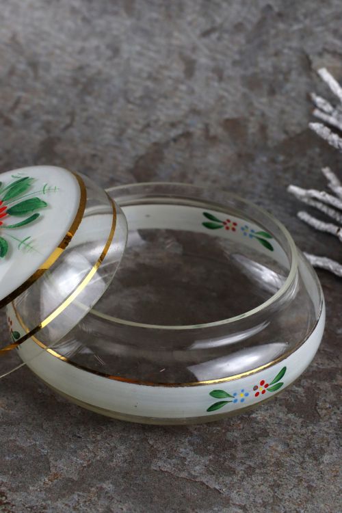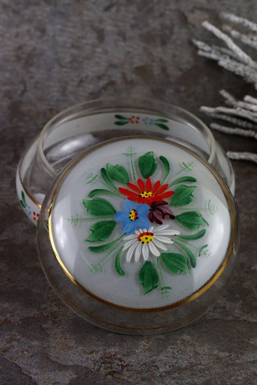Szklana bombonierka z ręcznie malowanymi kwiatami. Szkło bezbarwne, częściowo satynowane.