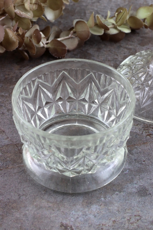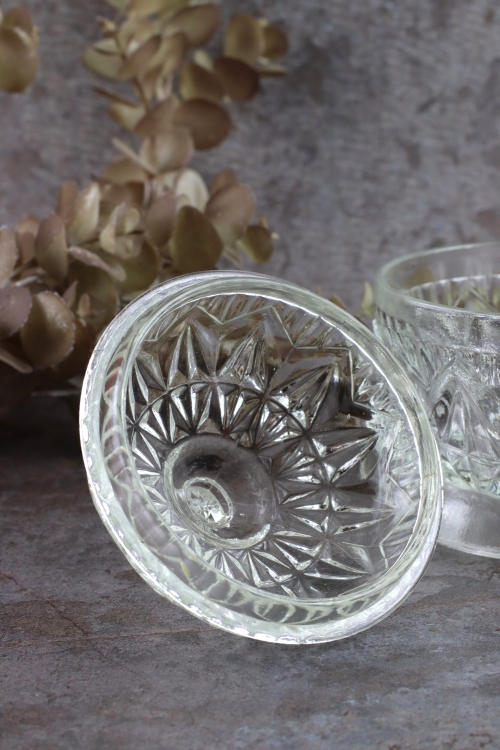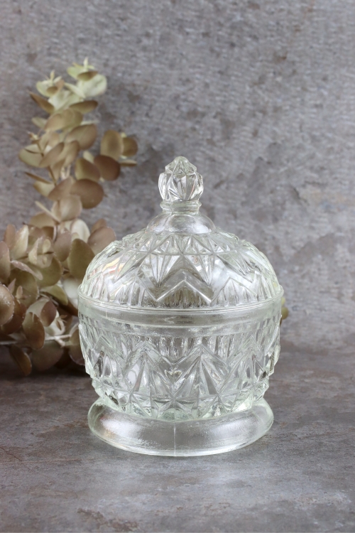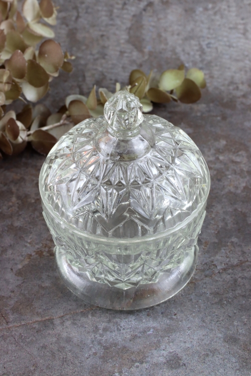 Szklana bombonierka z przykrywką wykonana ze szkła prasowanego.