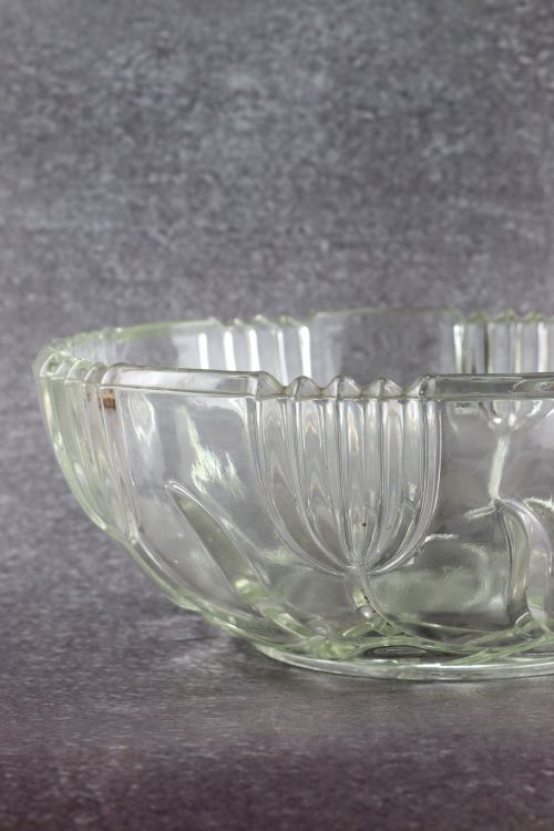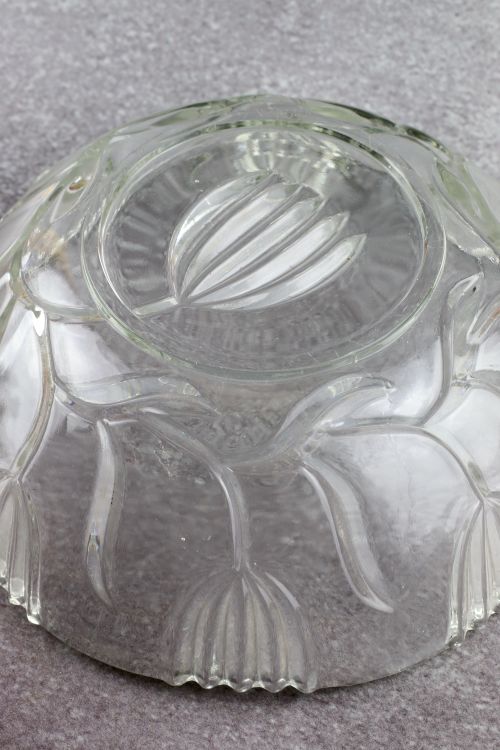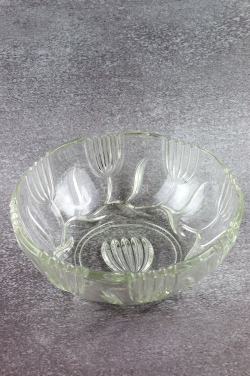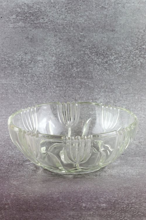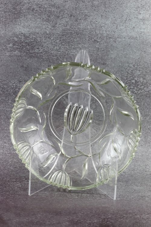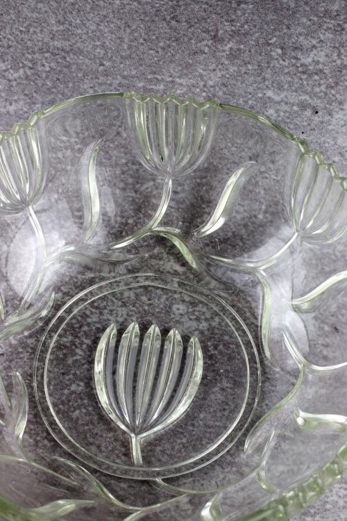 Szklana misa tulipany wykonana w Hucie Hortensja. Szkło prasowane, bezbarwne.