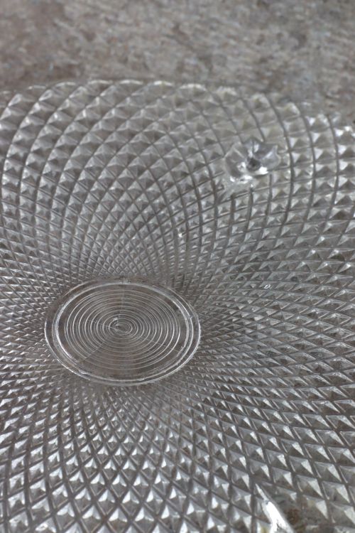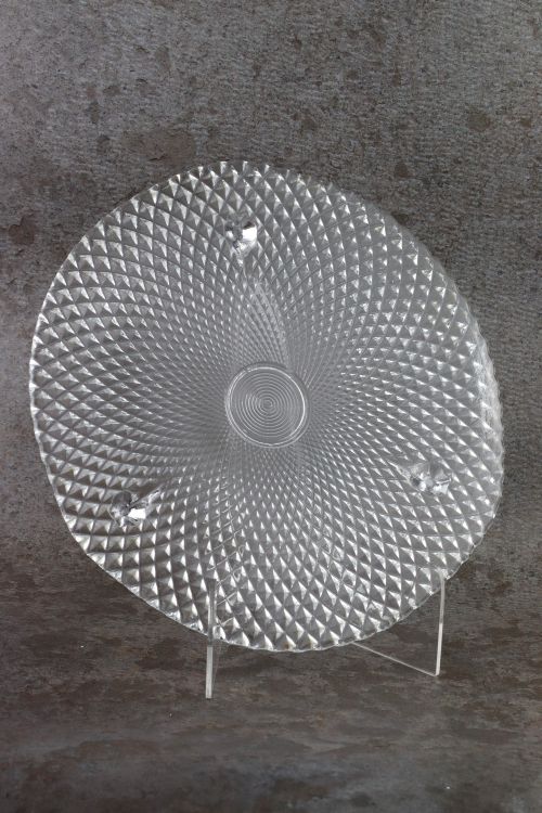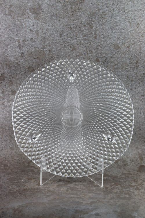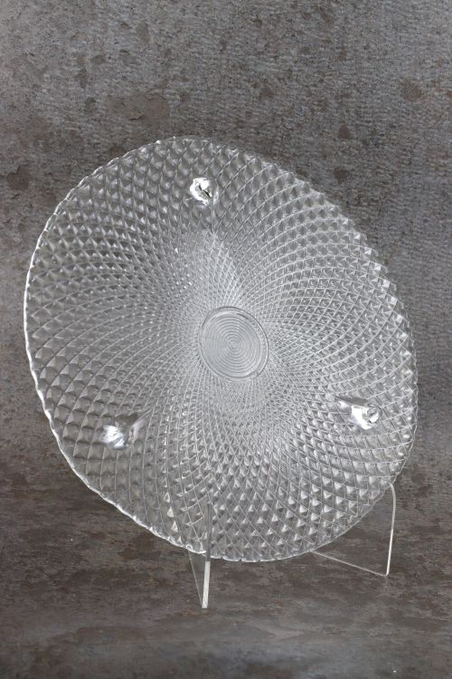 Szklana patera na trzech nóżkach dekorowana geometrycznym reliefem.
