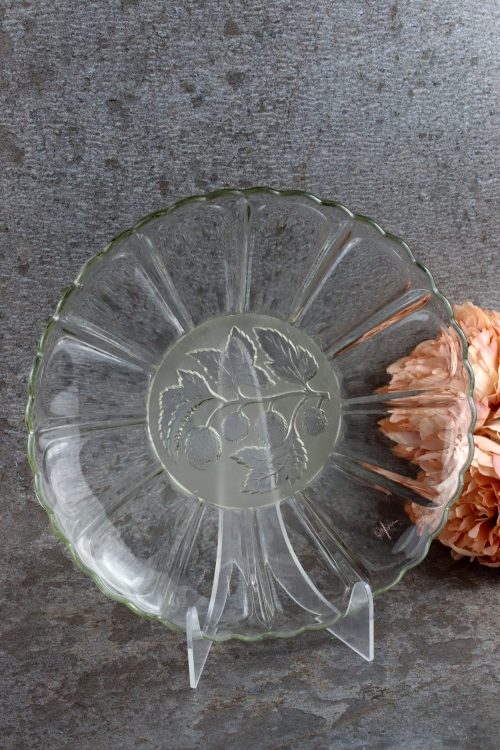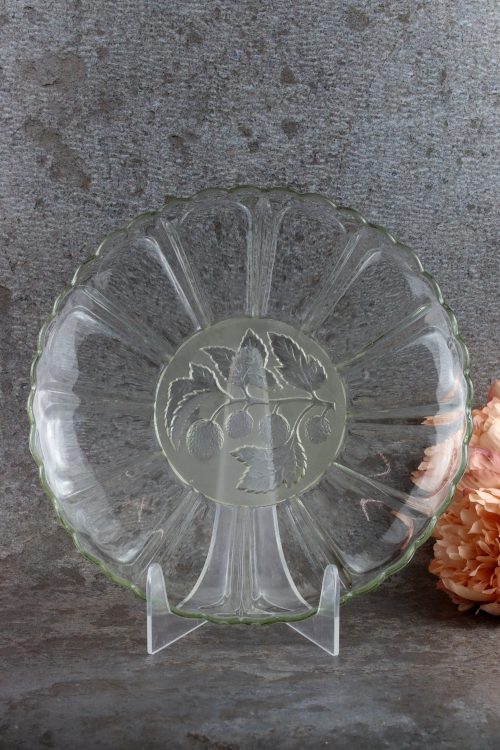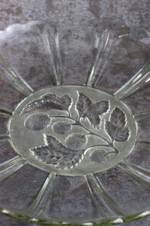 Szklana patera z owocami wykonana ze szkła prasowanego w Hucie Hortensja.