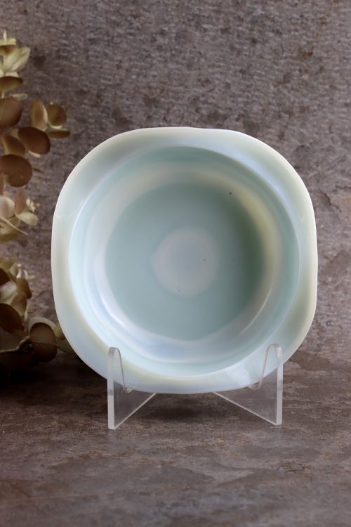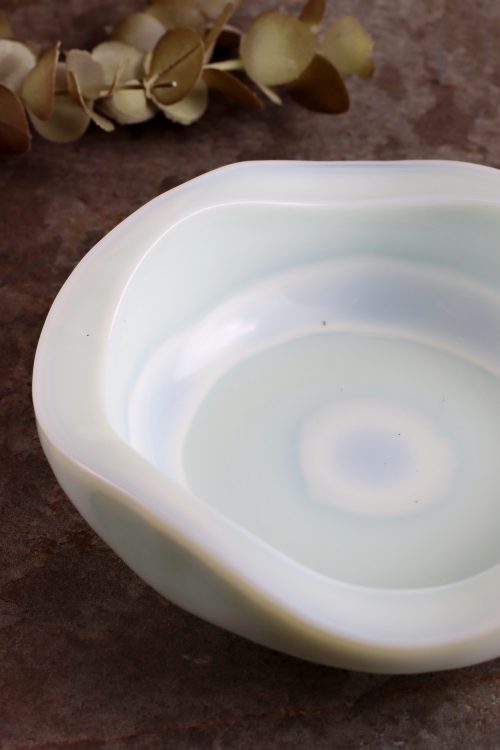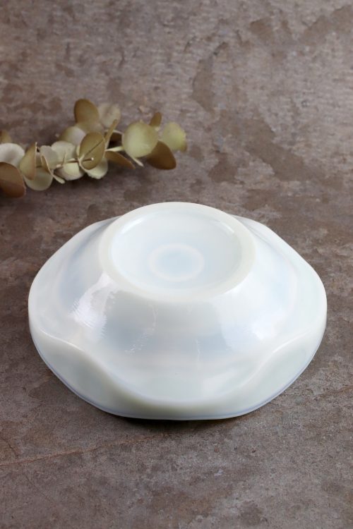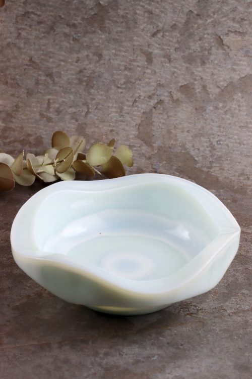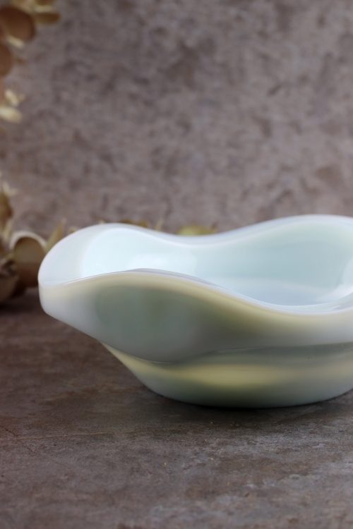 Szklana popielnica w lattimo zaprojektowana przez Jana Sylwestra Drosta, wykonana w Hucie Szkła Gospodarczego “Ząbkowice”. Szkło prasowane, barwione w masie na biało, z delikatnym miętowym odcieniem i smugami koloru.