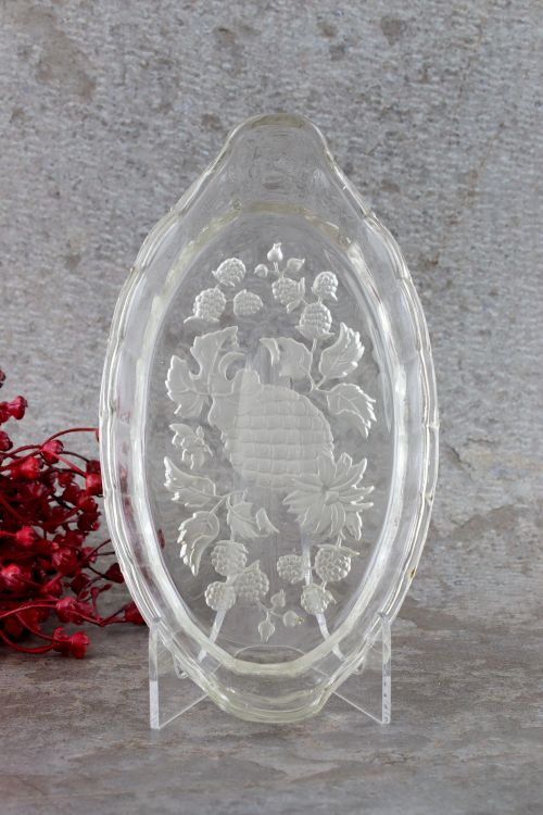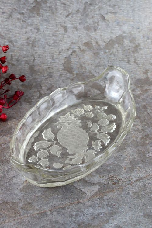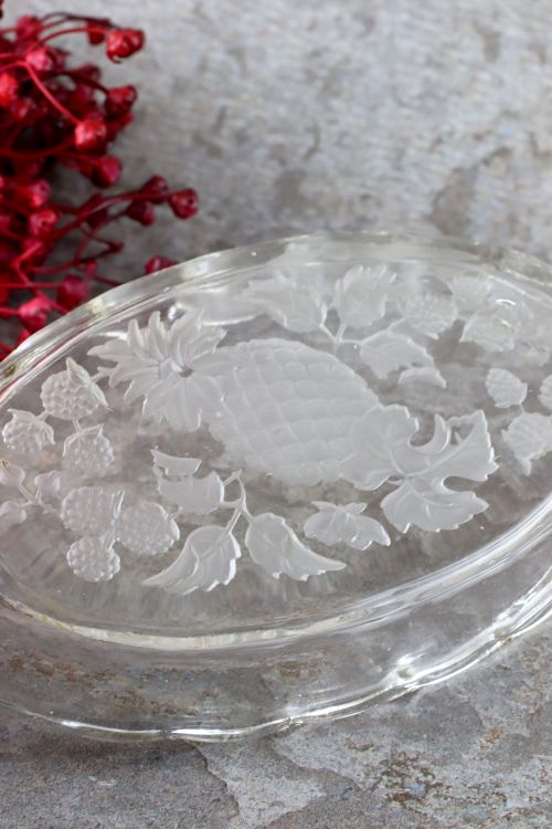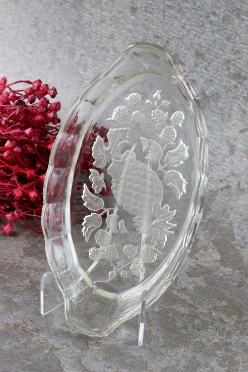 Szklana taca z motywem owoców. Szkło bezbarwne, częściowo matowione.