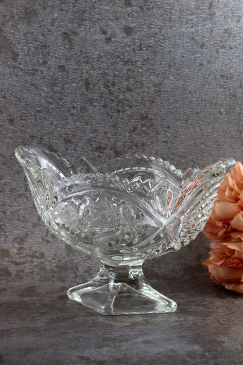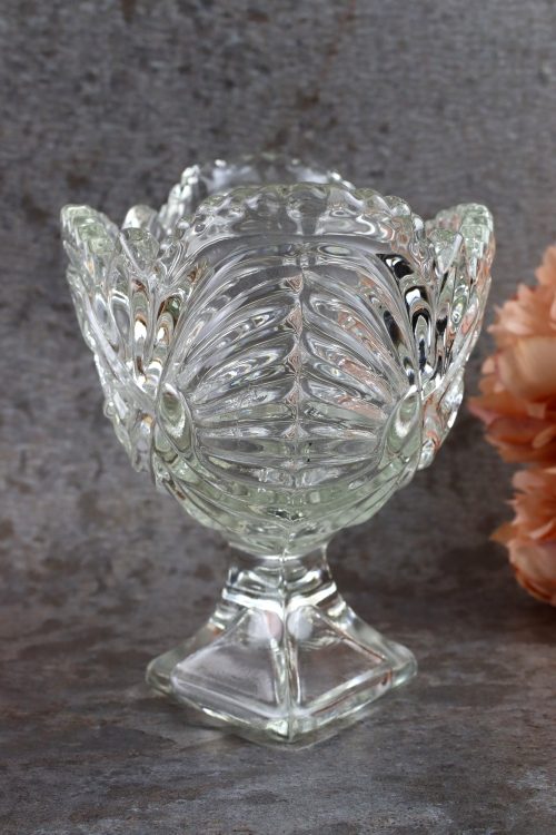 Szklana żardiniera z różą w rozkloszowanej formie, wykonana w Hucie Hortensja.