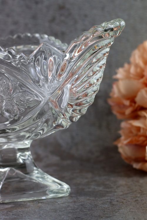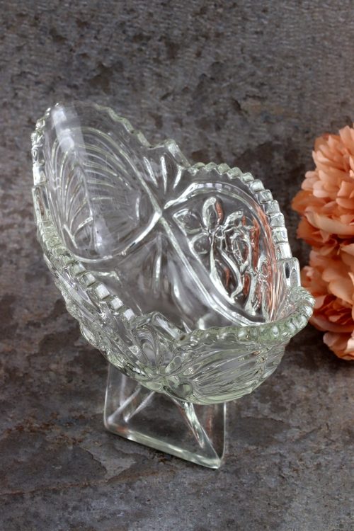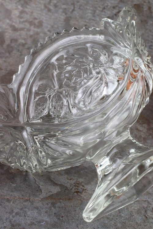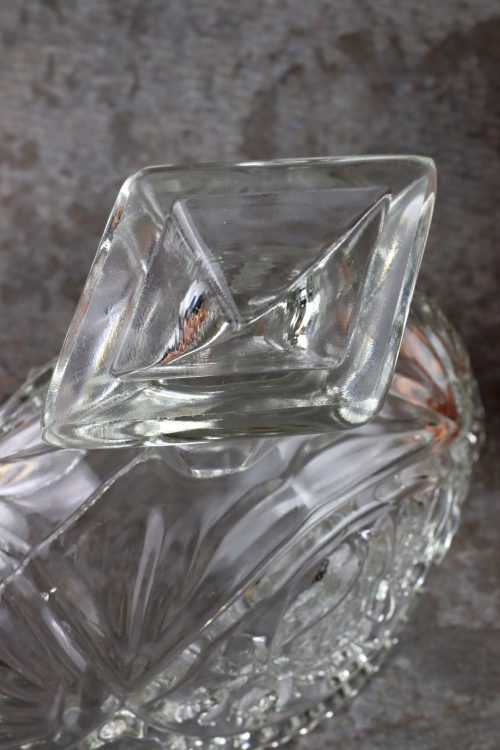Stan bardzo dobry, wady produkcyjne [włosowate, zatopione bąbelki powietrza, nierówności na szkle]. Na spodzie stopy rysy użytkowe.