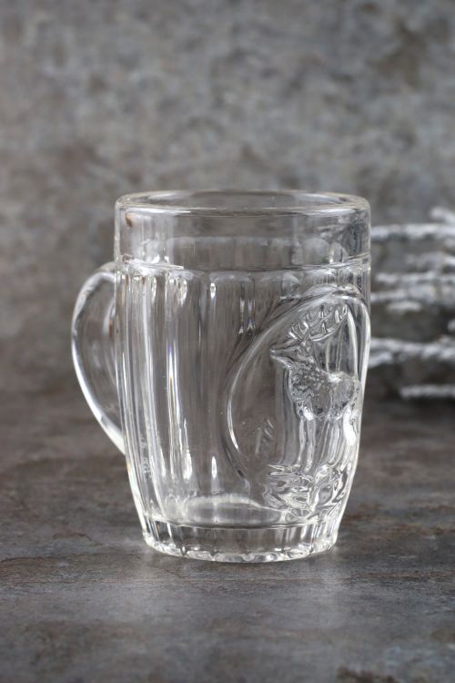 Szklany kufelek z małpką wykonany w Hucie Szkła Gospodarczego “Ząbkowice”.