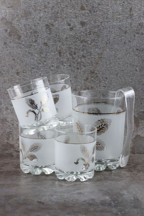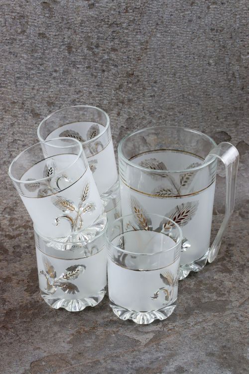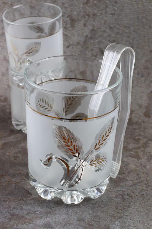 Szklany zestaw do napojów – pojemnik na lód, pięć szklanek oraz plastikowe szczypce.