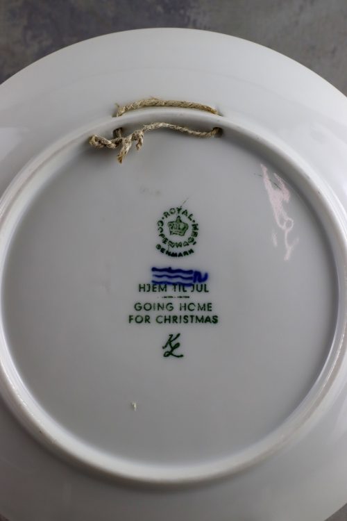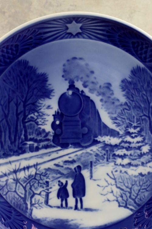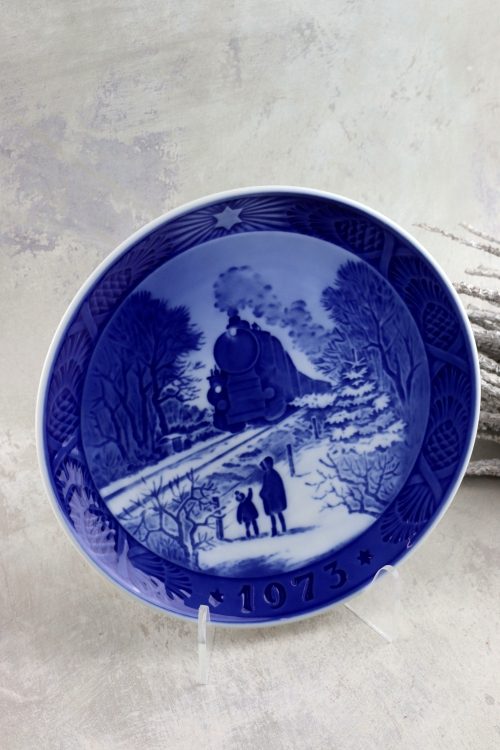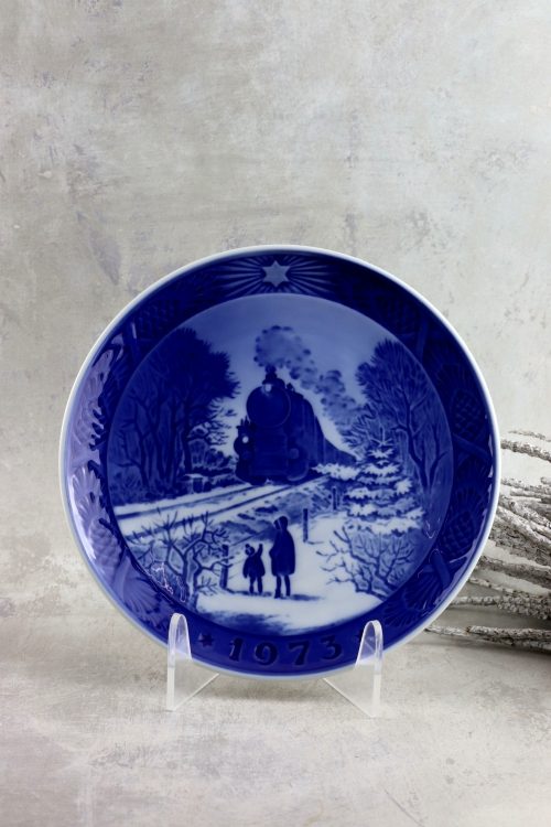 Talerz świąteczny z 1973 roku wykonany przez firmę Royal Copenhagen. Porcelana biała z niebieską i kobaltową dekoracją.