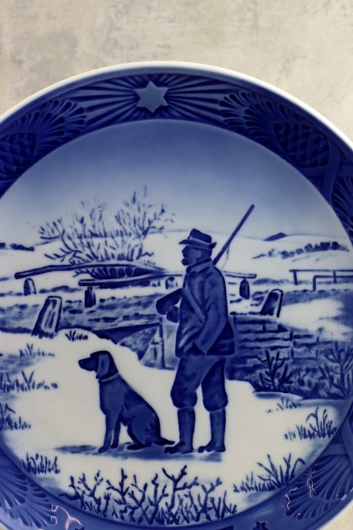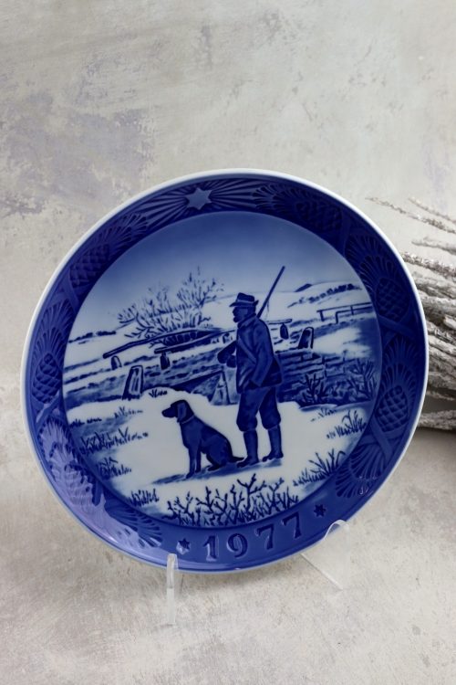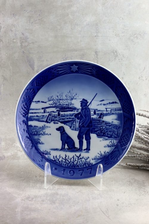 Talerz świąteczny z 1977 roku wykonany przez firmę Royal Copenhagen. Porcelana biała z niebieską i kobaltową dekoracją.