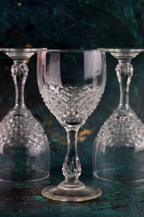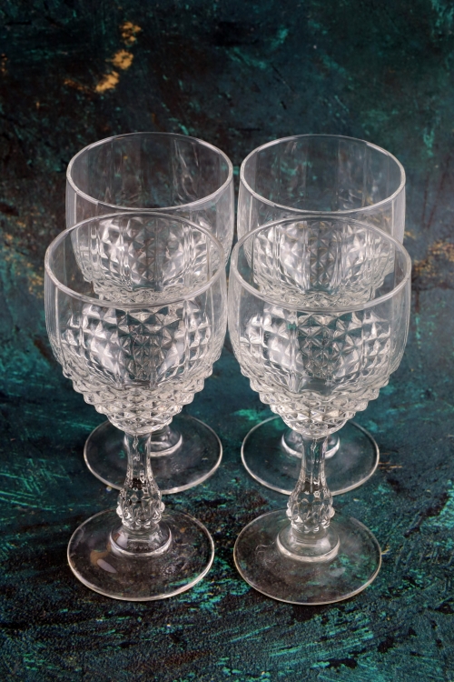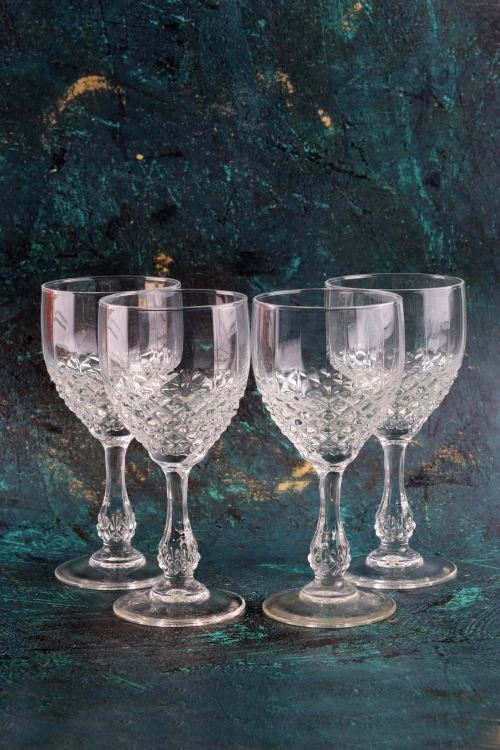 Zestaw czterech szklanych kieliszków wykonanych ze szkła bezbarwnego.