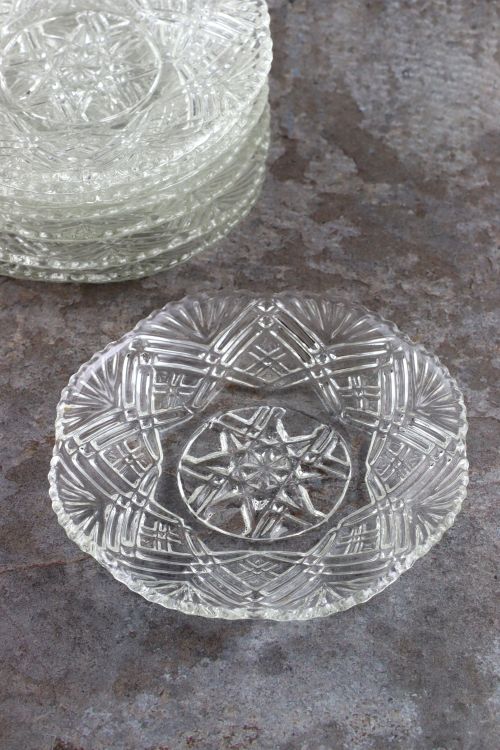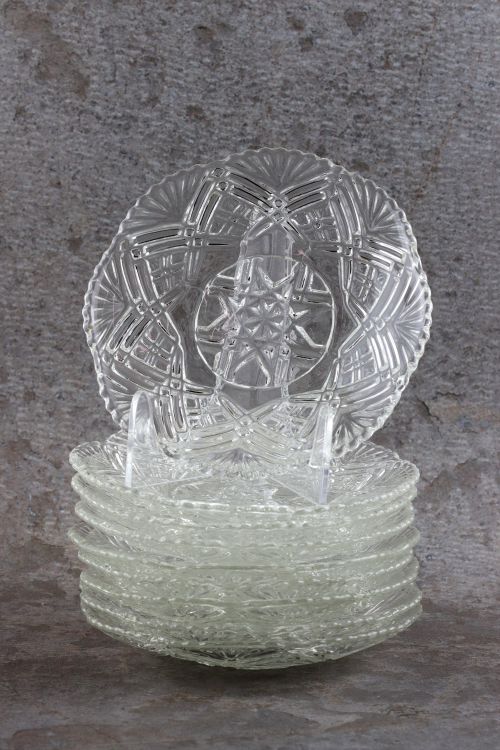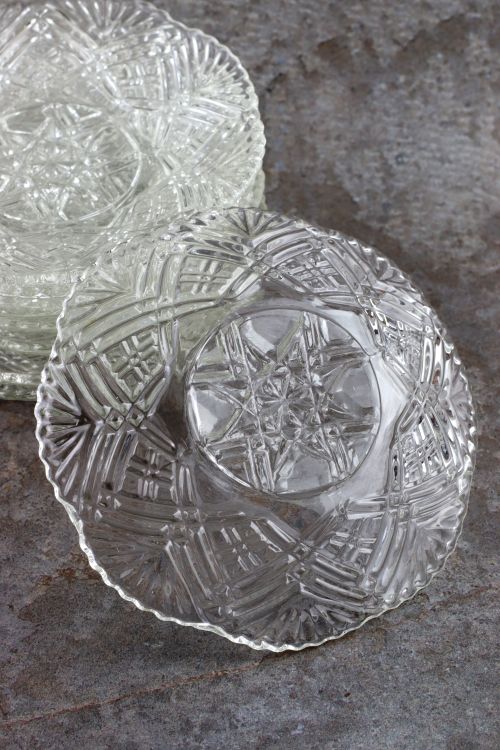 Zestaw dziewięciu szklanych talerzyków zdobionych geometrycznym reliefem.