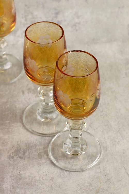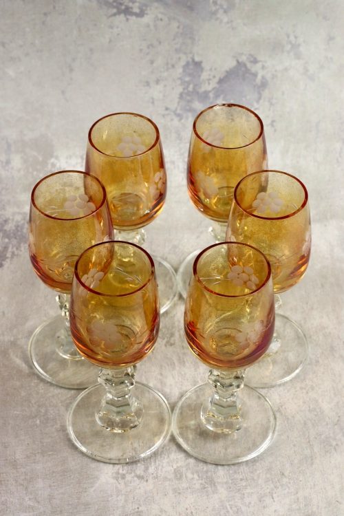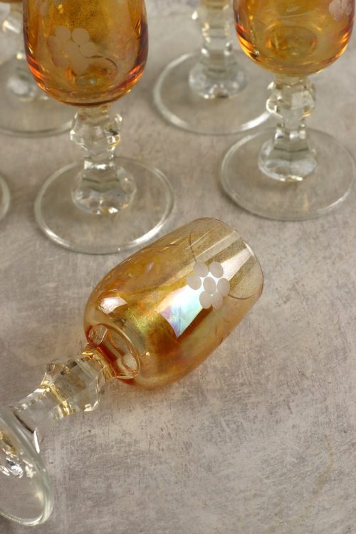 Zestaw sześciu iryzowanych kieliszków z delikatnym roślinnym motywem.