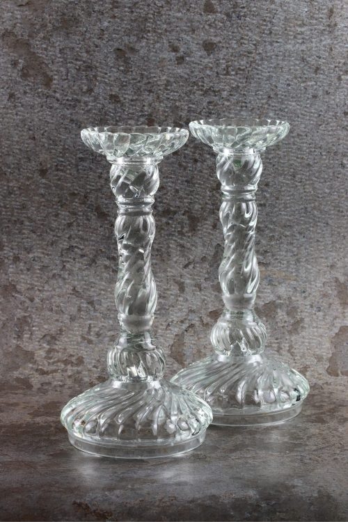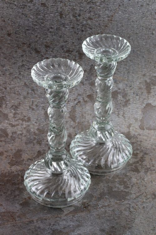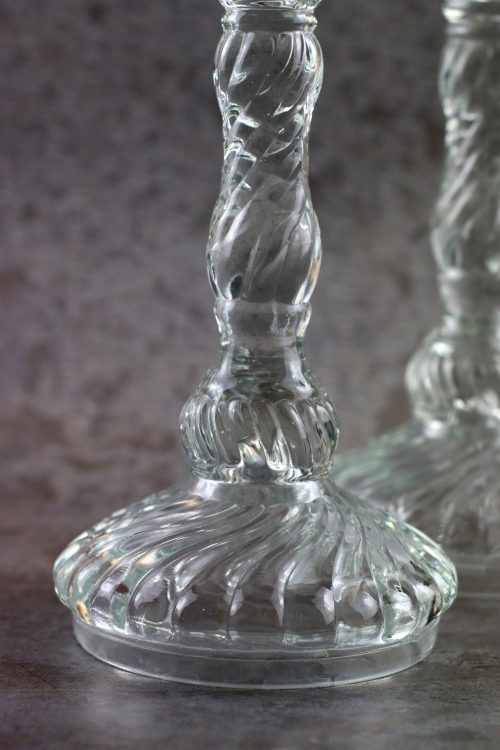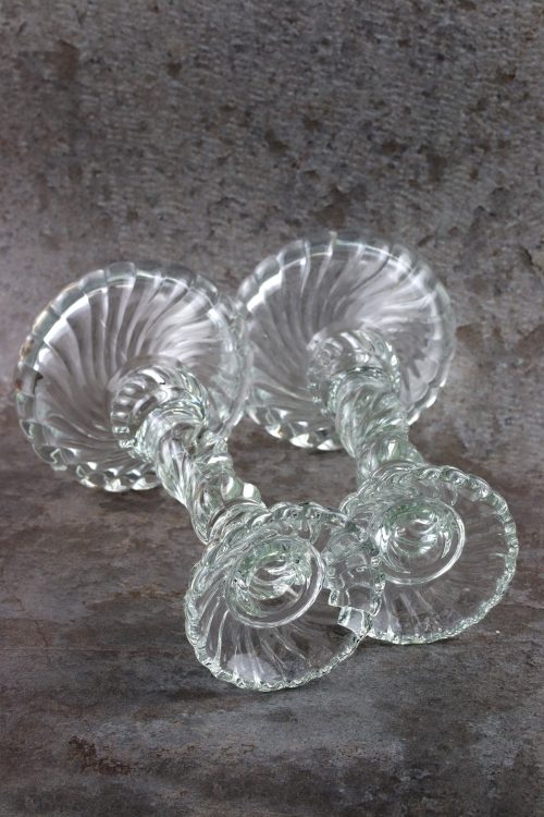 Zestaw dwóch świeczników Spirelli zaprojektowanych przez Ryszarda Serwickiego, wykonanych w Hucie Szkła Gospodarczego “Ząbkowice”.