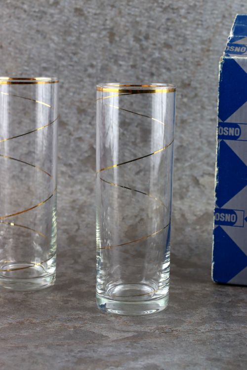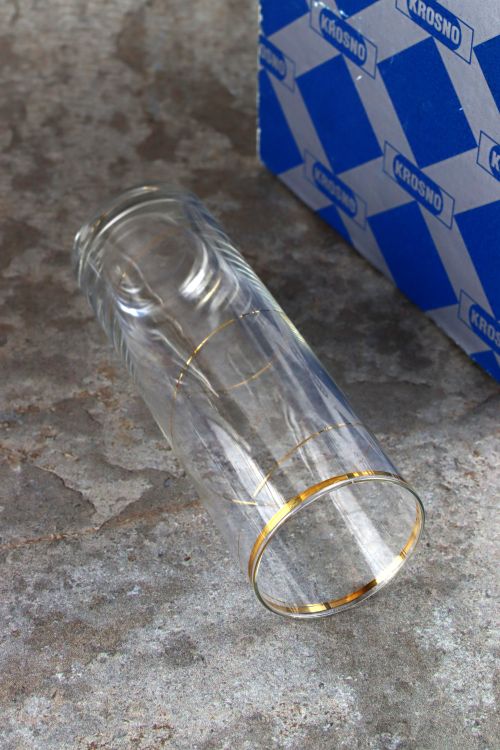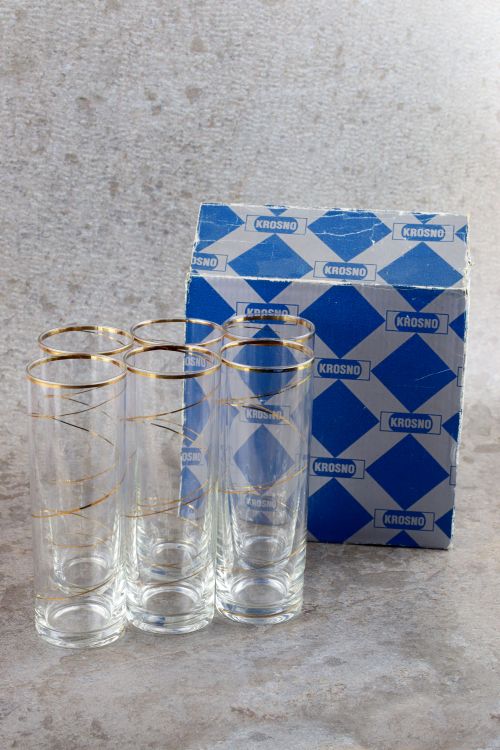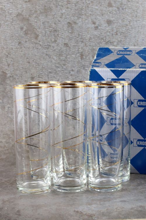Zestaw szklanek ze złotym dekorem wykonanych w Hucie Krosno. Zestaw sześciu sztuk w oryginalnym opakowaniu.