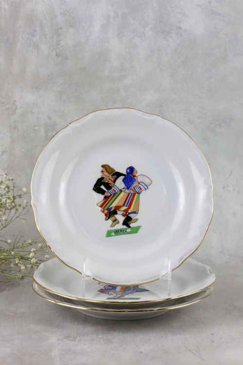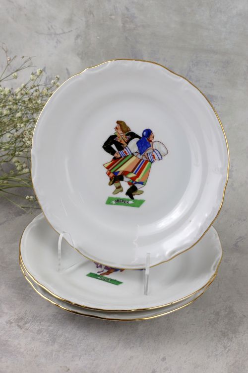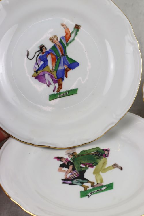 Zestaw talerzyków tańce polskie z motywami mazura, oberka i polki, wykonane w zakładach Chodzież.