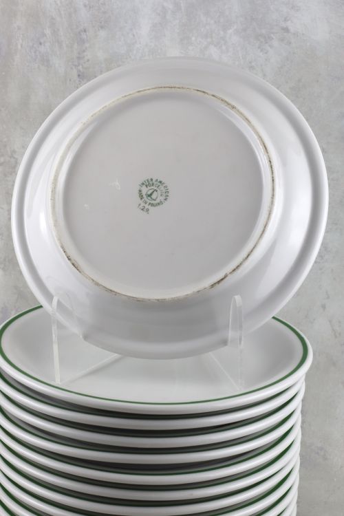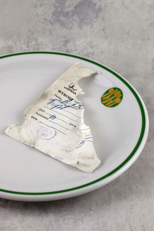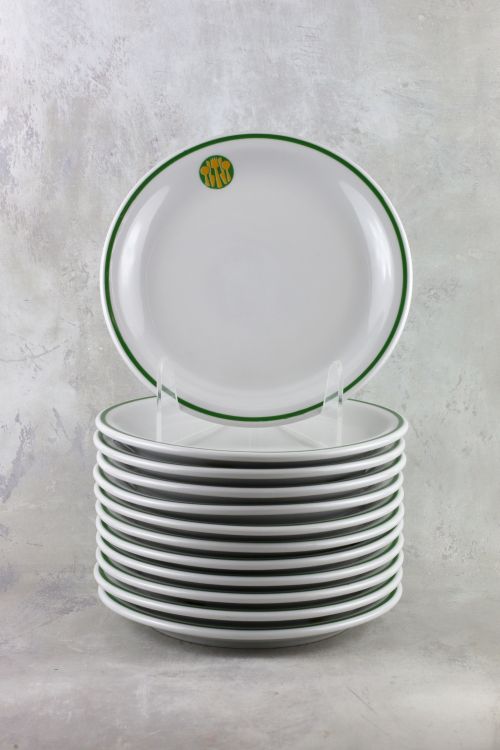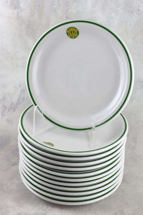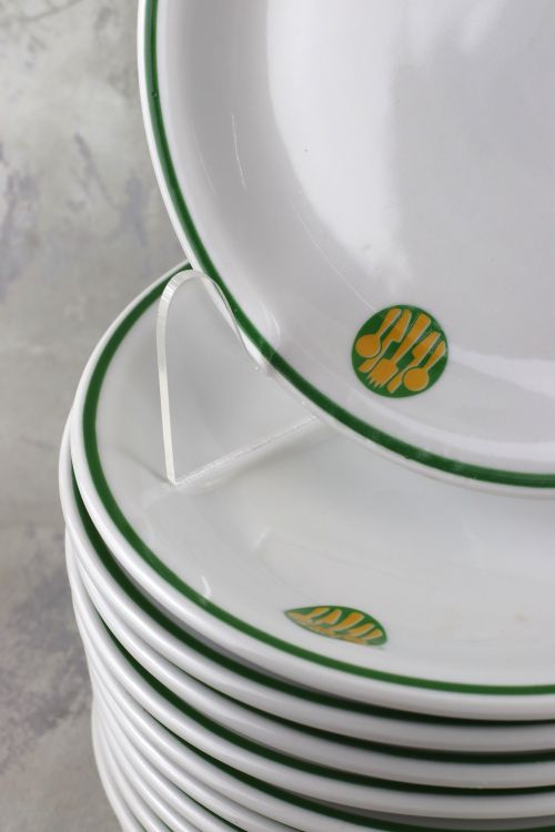 Zestaw dwunastu talerzyków ze stołówki z motywem sztućców, wykonanych w zakładach Lubiana.