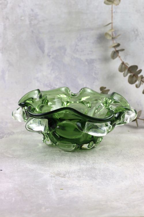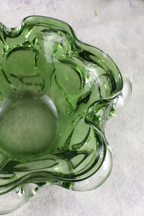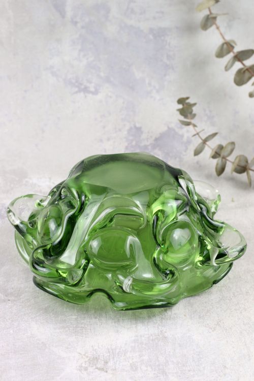 Zielona szklana popielniczka wykonana ze szkła barwionego w masie, z dekoracyjnymi bezbarwnymi wypustkami.
